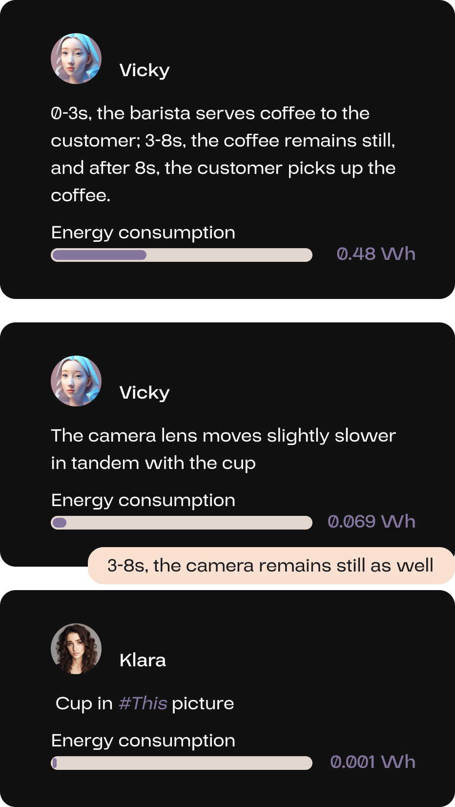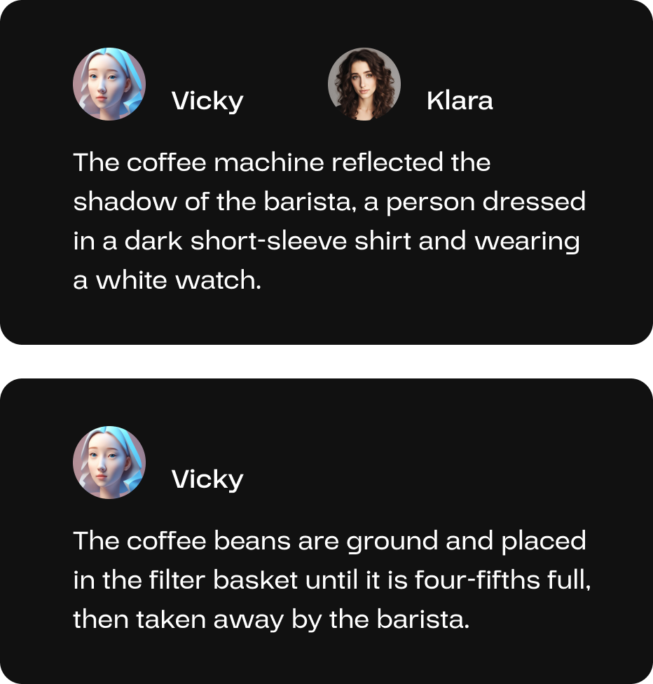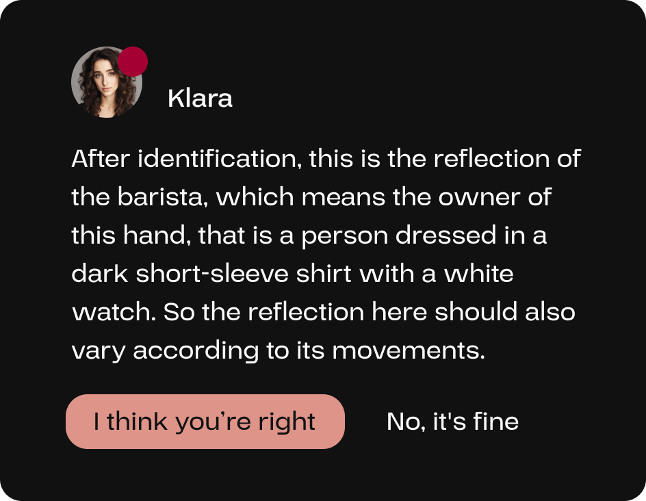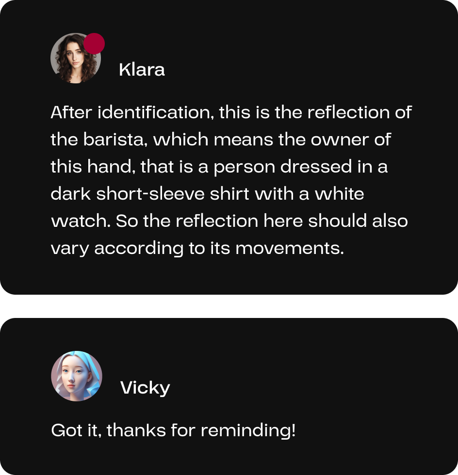 Through object detection, Klara has identified that the coffee machine in the video reflected the barista, thereby informing the user and the AI video expert Vicky to ensure that reflections are accurately represented during the video generation process.