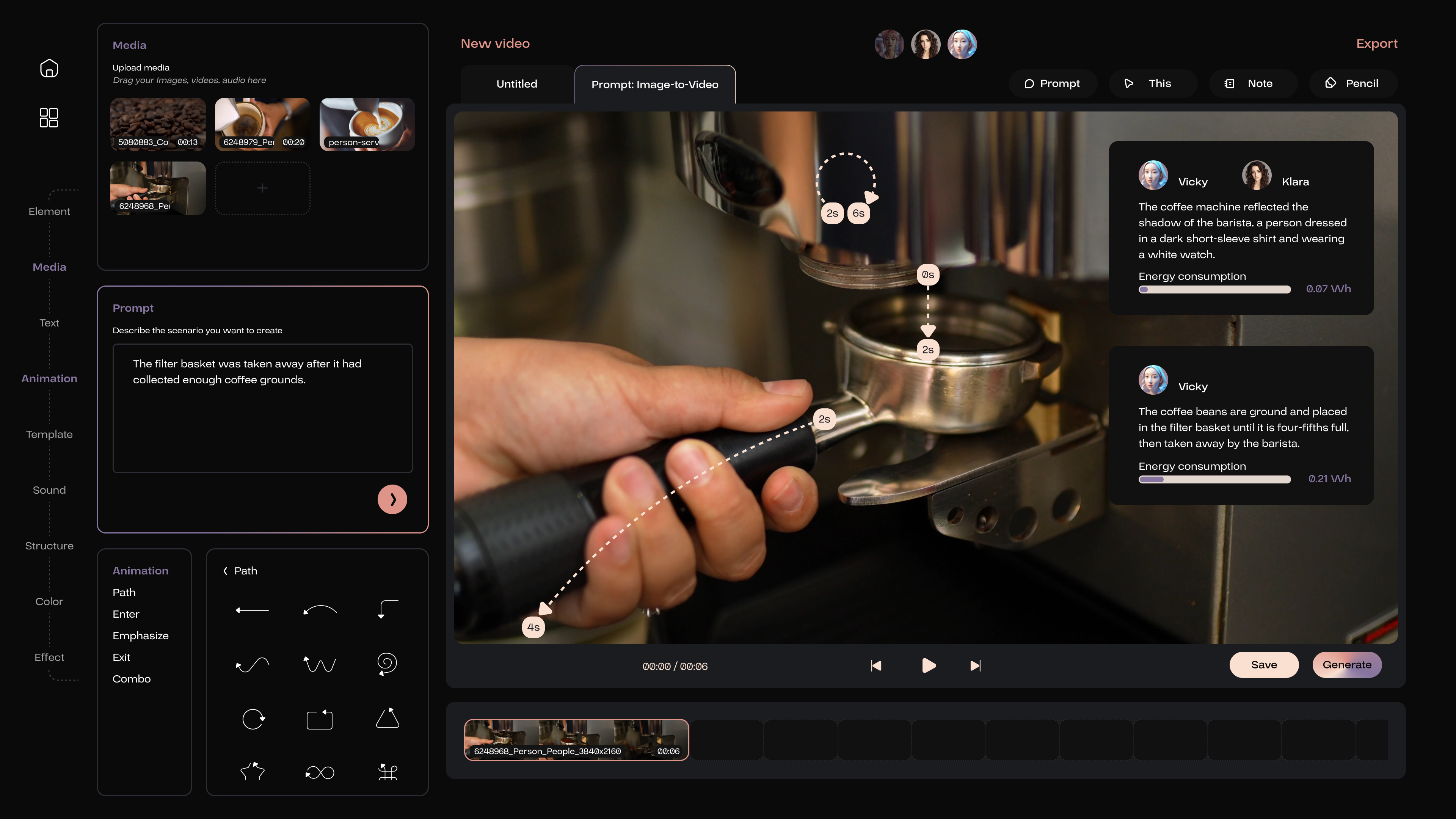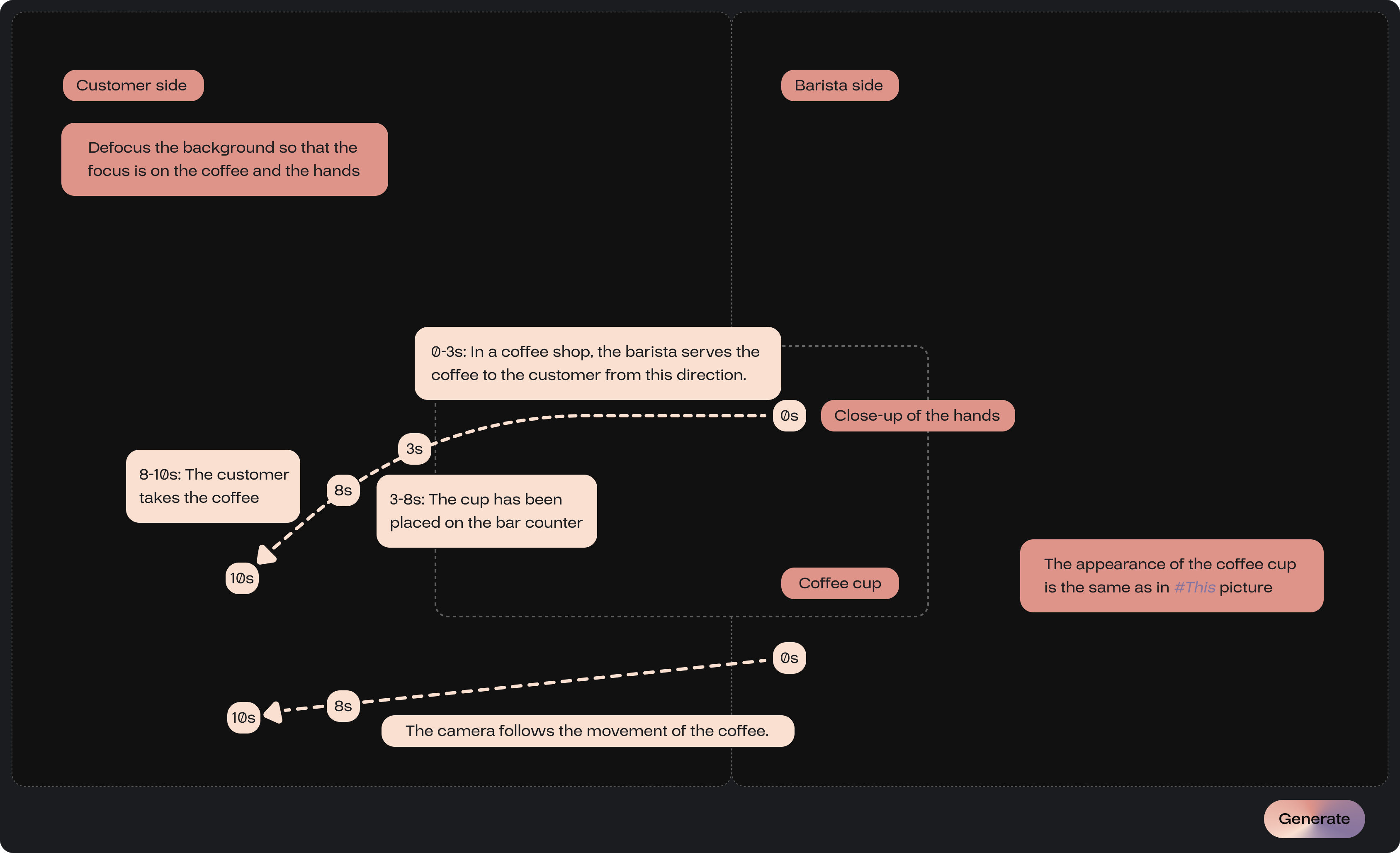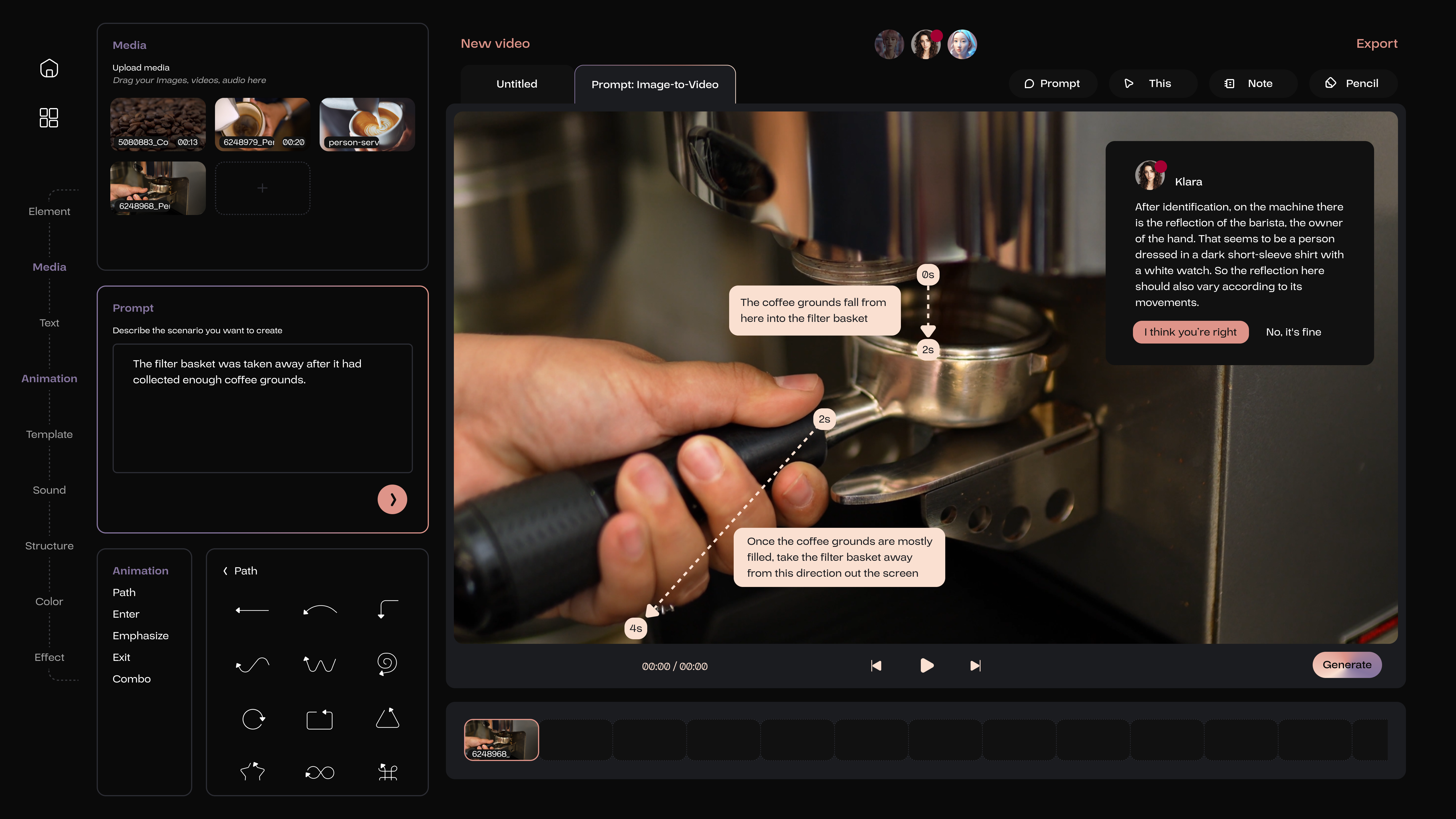 Through object detection, Klara has identified that the coffee machine in the video reflected the barista, thereby informing the user and the AI video expert Vicky to ensure that reflections are accurately represented during the video generation process.