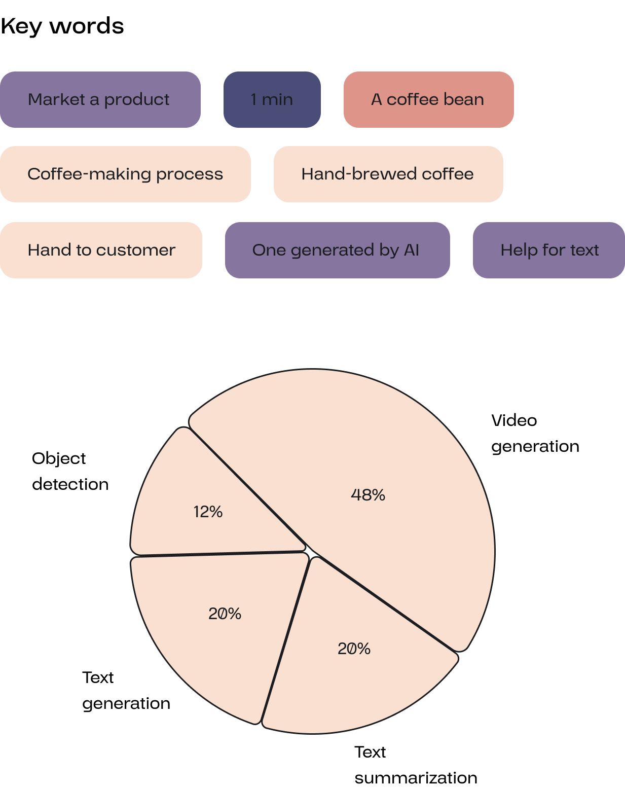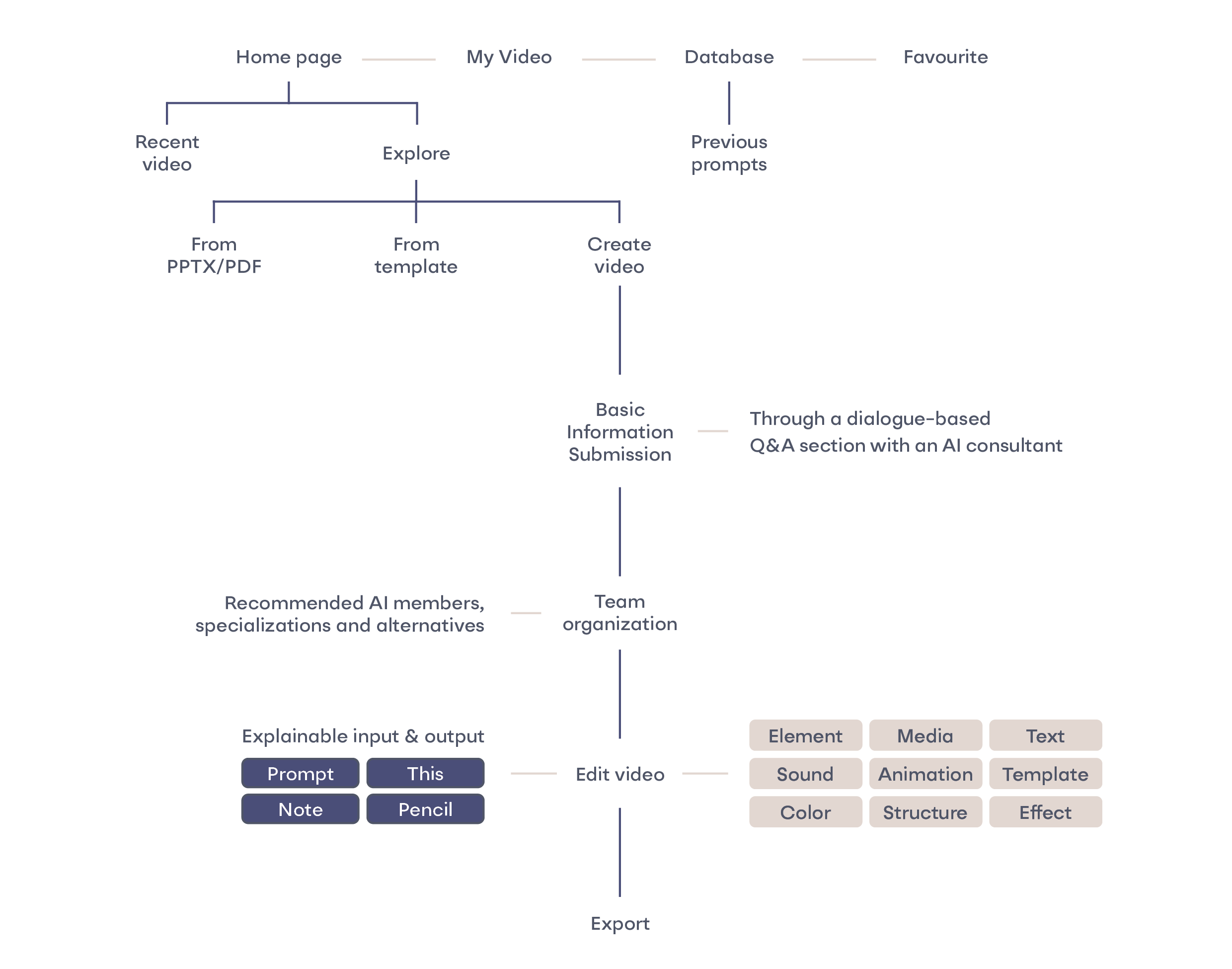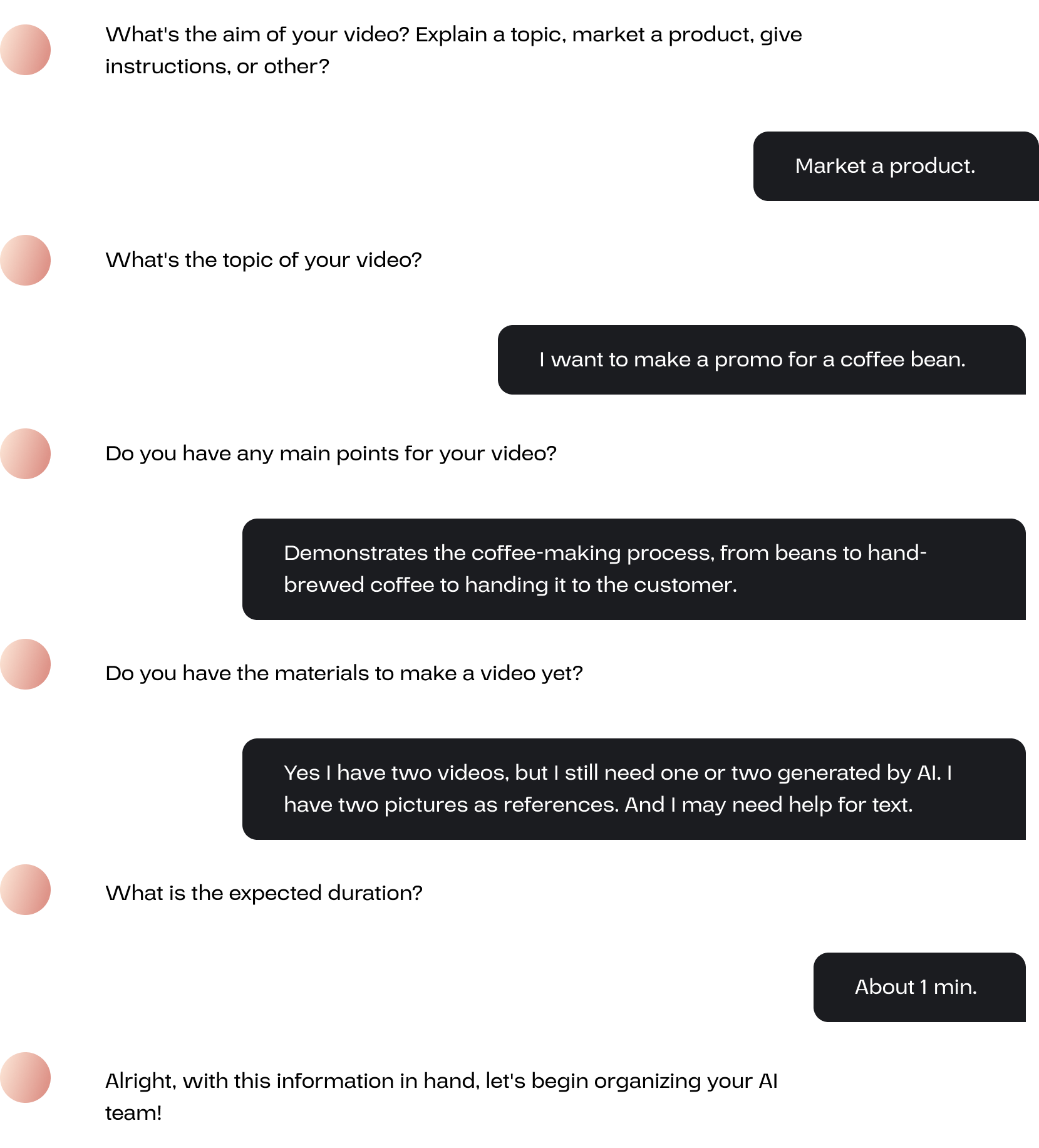 The user will first be asked several questions regarding the video’s purpose, topic, and main points. The user should also inform what kind of materials they already have and their requirements for the tasks, in order to receive appropriate recommendations for the AI team.