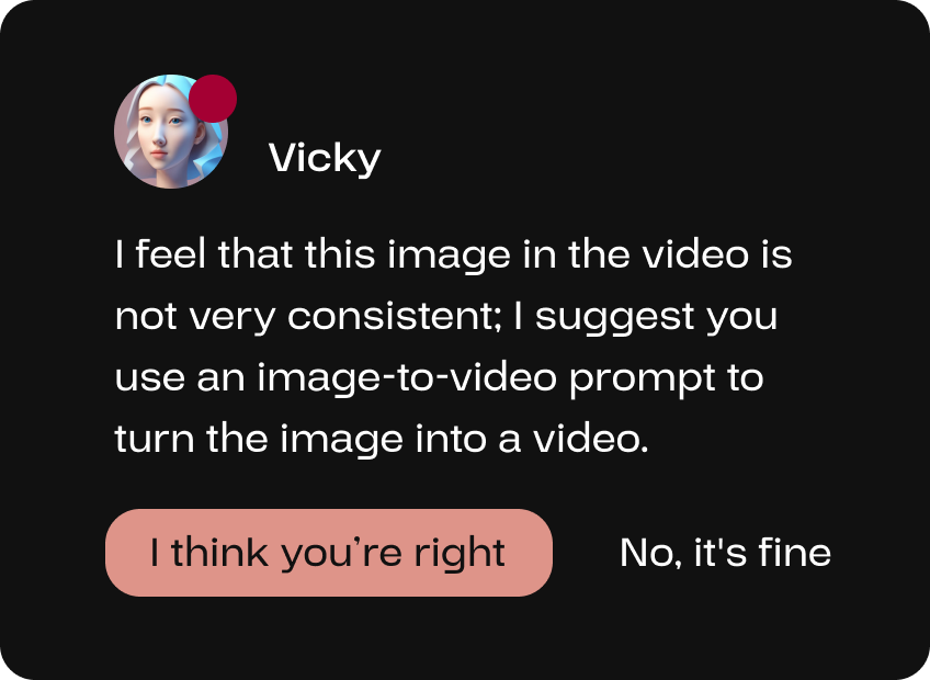 If the user has a video sequence but with an image placed in between, the video AI expert Vicky, with extensive experience in video editing, can help the user convert this image into a video to enhance the overall coherence of the video.